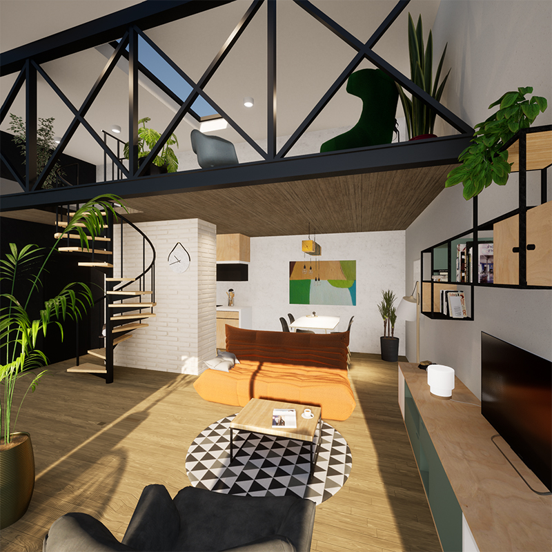 Antresola jest dostępna poprzez schody, które prowadzą z salonu na piętro. Na antresoli znajduje się duża przestrzeń, która może zostać wykorzystana na różne sposoby w zależności od potrzeb mieszkańców. Dodatkowo, dzięki dużym oknom, antresola jest jasna i oświetlona naturalnym światłem, co sprawia, że jest to idealne miejsce do wypoczynku lub pracy.